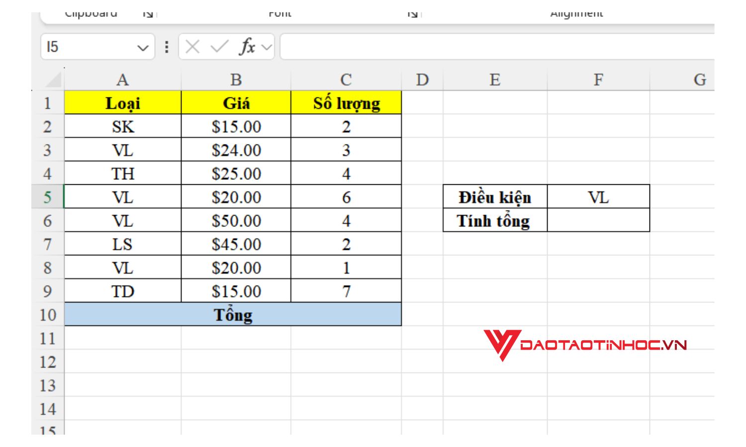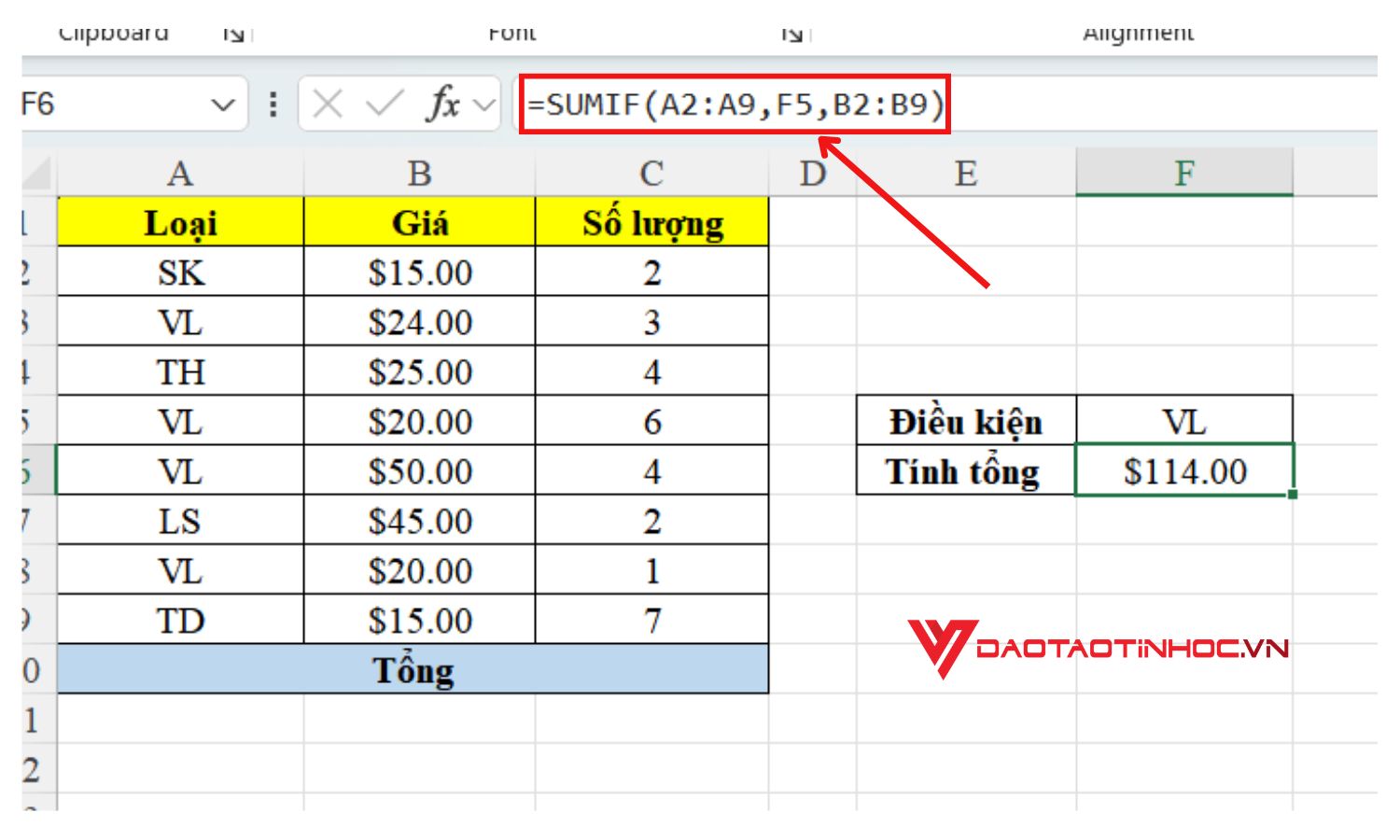 Ta xác định được vùng chứa dữ liệu cần tính tổng là B2:B9, điều kiện của phép tính là “VL” hoặc có thể chọn ô F5, và vùng chứa điều kiện là A2:A9.