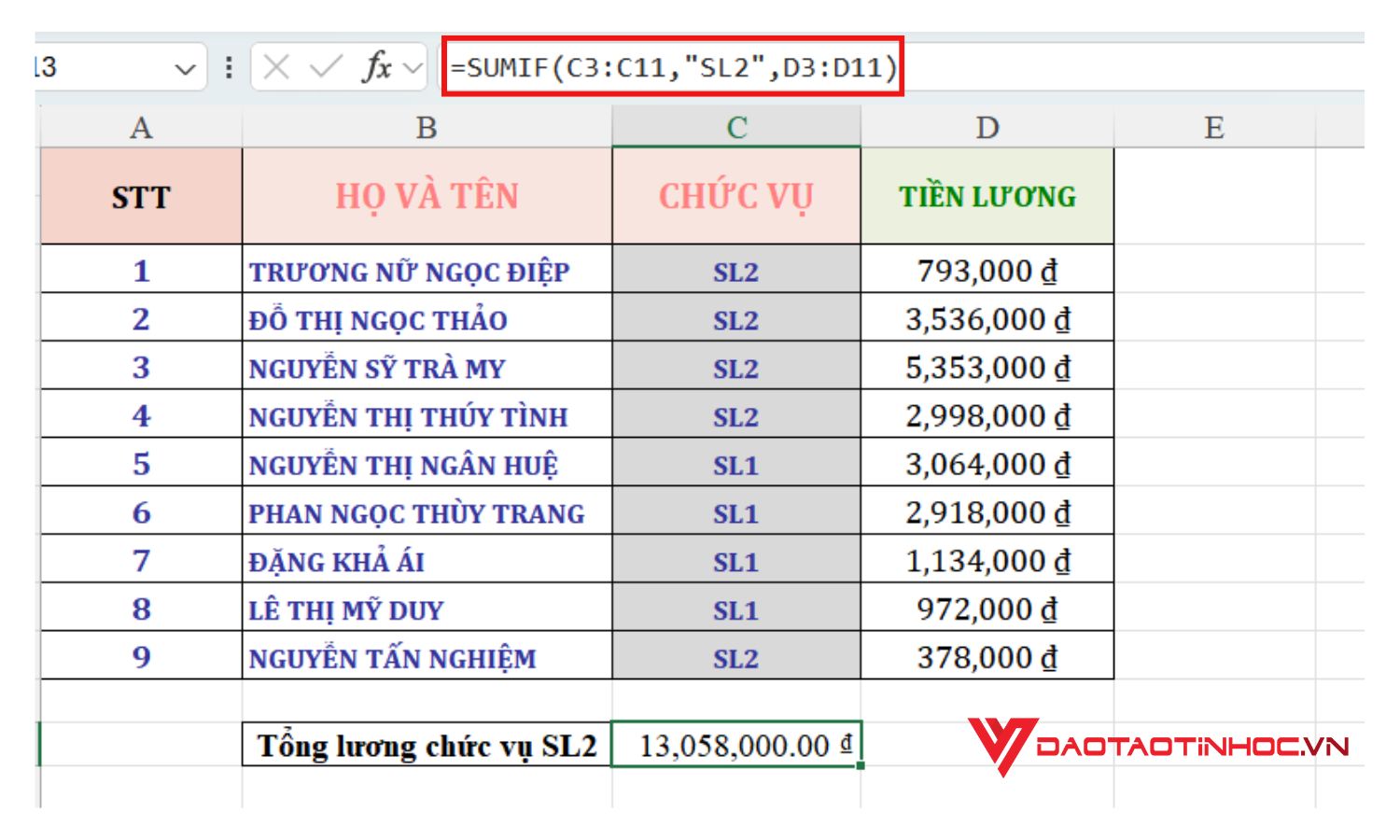 Ví dụ 2: Ta có bảng tính lương của một số nhân viên, yêu cầu tính tổng tiền lương theo từng chức vụ SL2, SL1. Cách sử dụng hàm SUMIF để tính tổng như sau