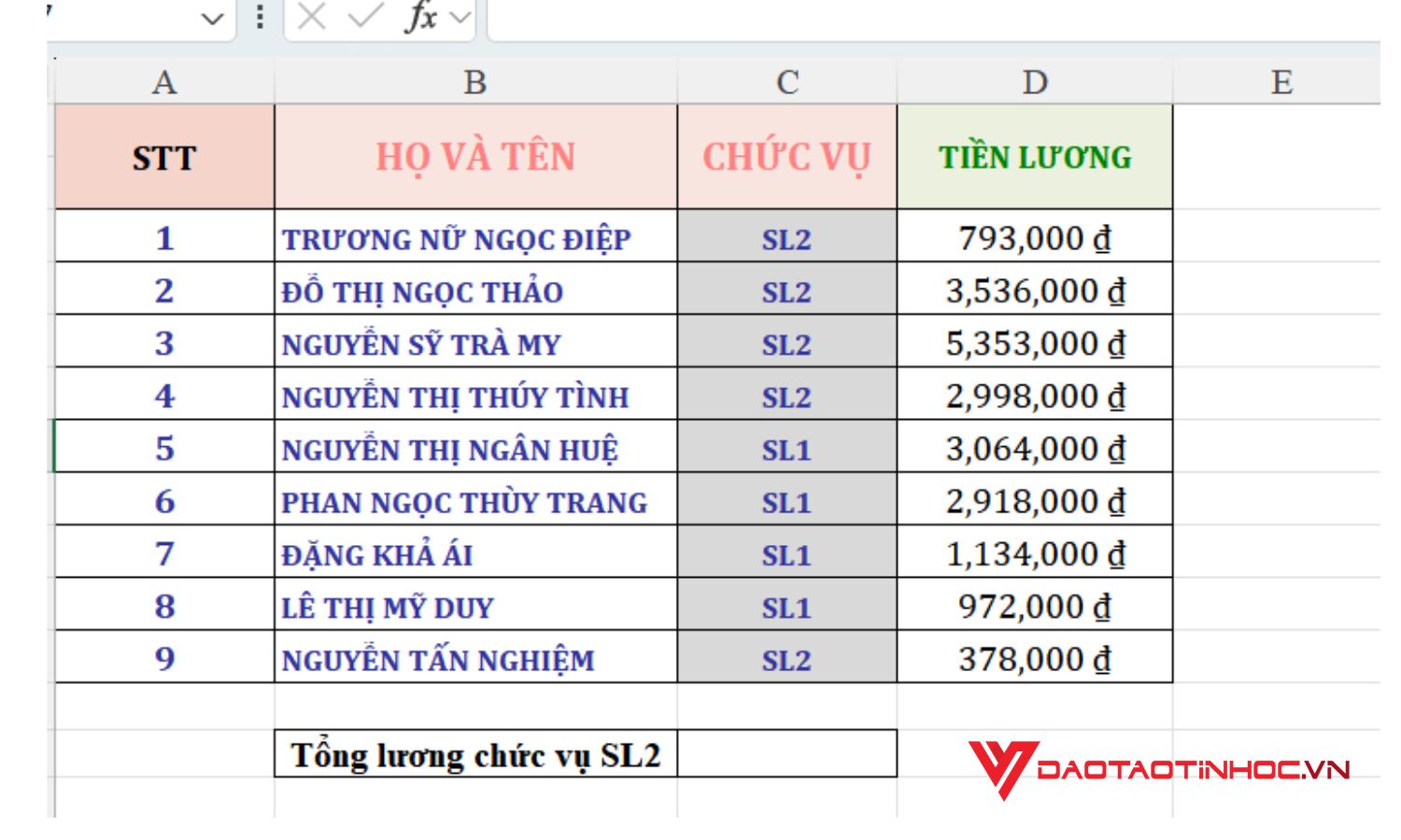 Áp dụng hàm SUMIF vào ta có công thức tính tổng lương chức vụ SL2 như sau: