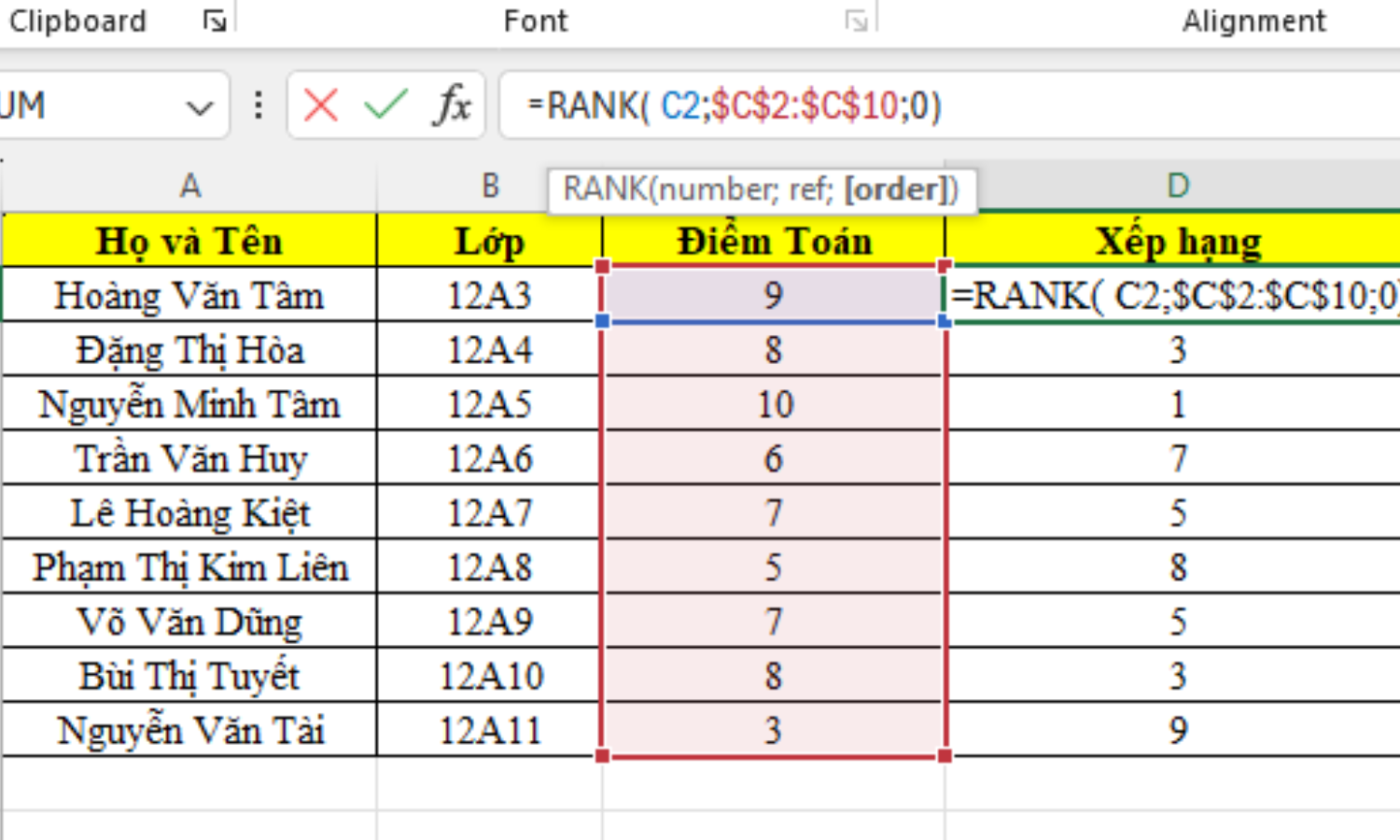 $C$2:$C$10 là vùng chứa số xếp hạng, bạn di chuyển chuột từ C2 đến C10 rồi kéo chọn cả bảng dữ liệu