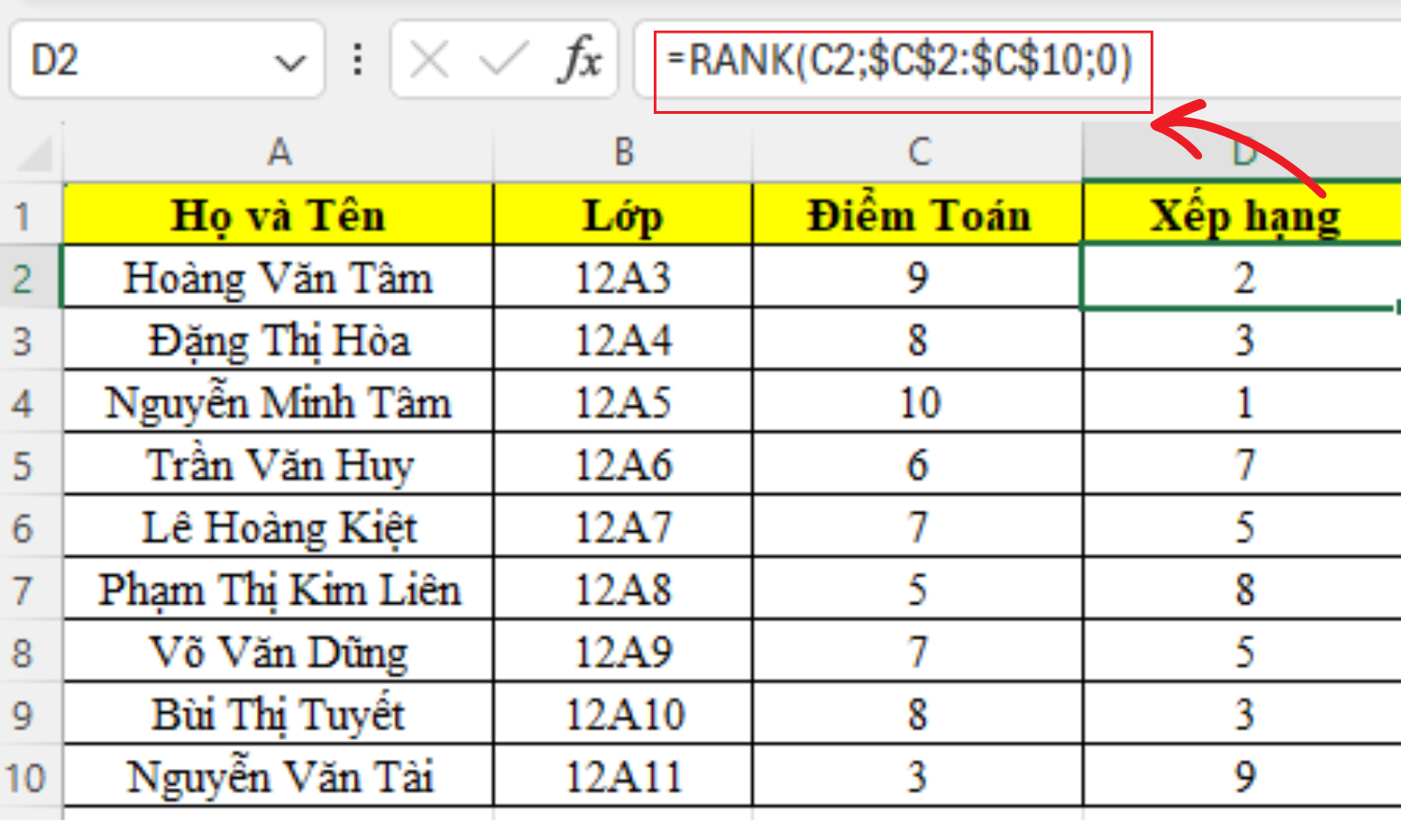 C2 là số mà bạn muốn tìm thứ hạng của nó (điểm số của bạn học sinh đầu bảng)