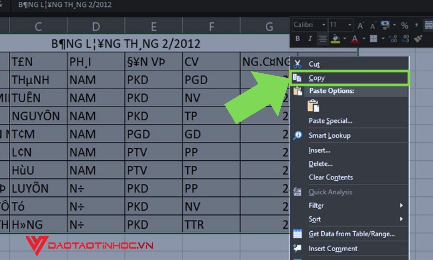 Bước 2: Mở file Excel bị lỗi và bôi đen để chọn vùng bị lỗi font chữ. Kế tiếp bạn nhấn tổ hợp phím tắt Ctrl + C để sao chép vùng bị lỗi. Hoặc bạn cũng có thể sử dụng chuột để phải để sao chép dữ liệu