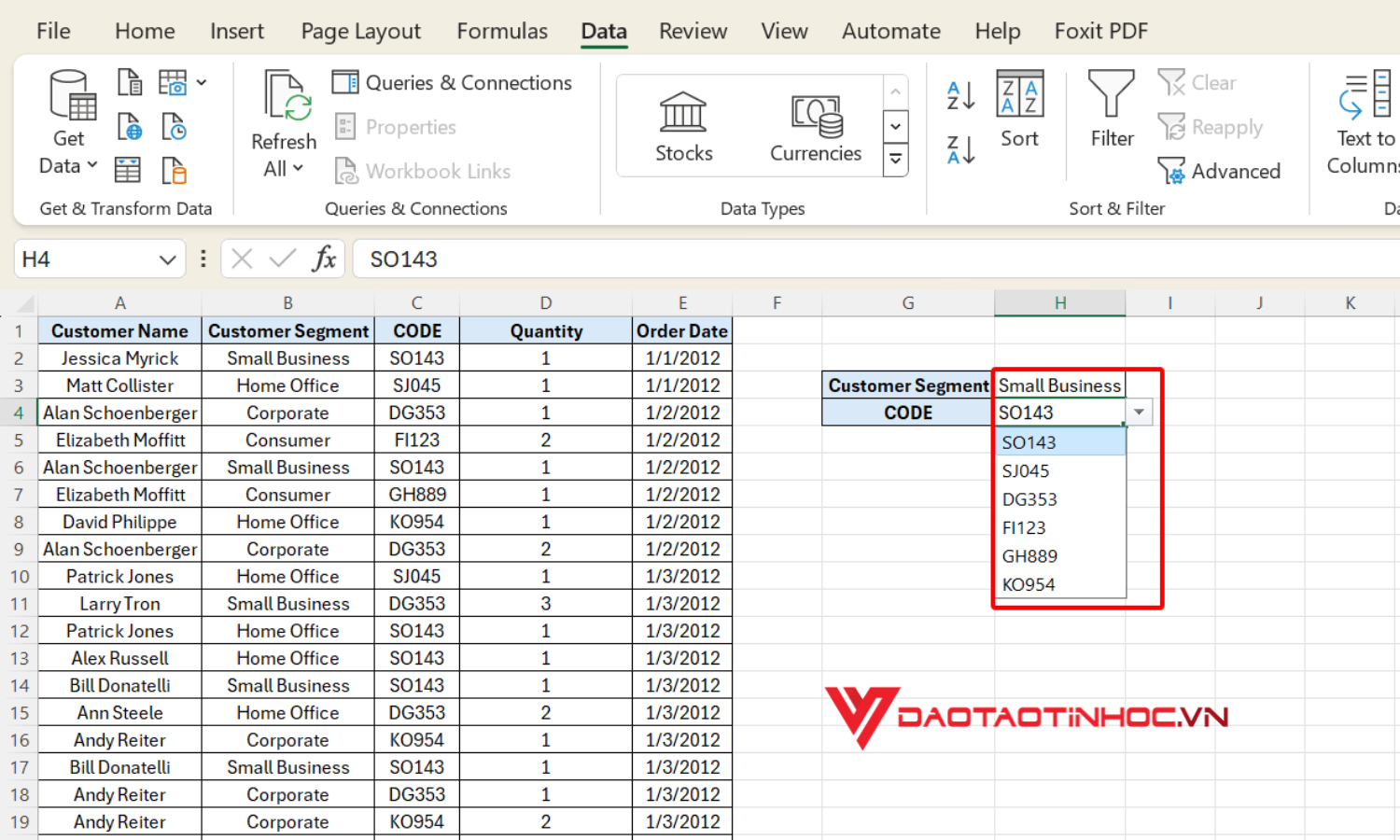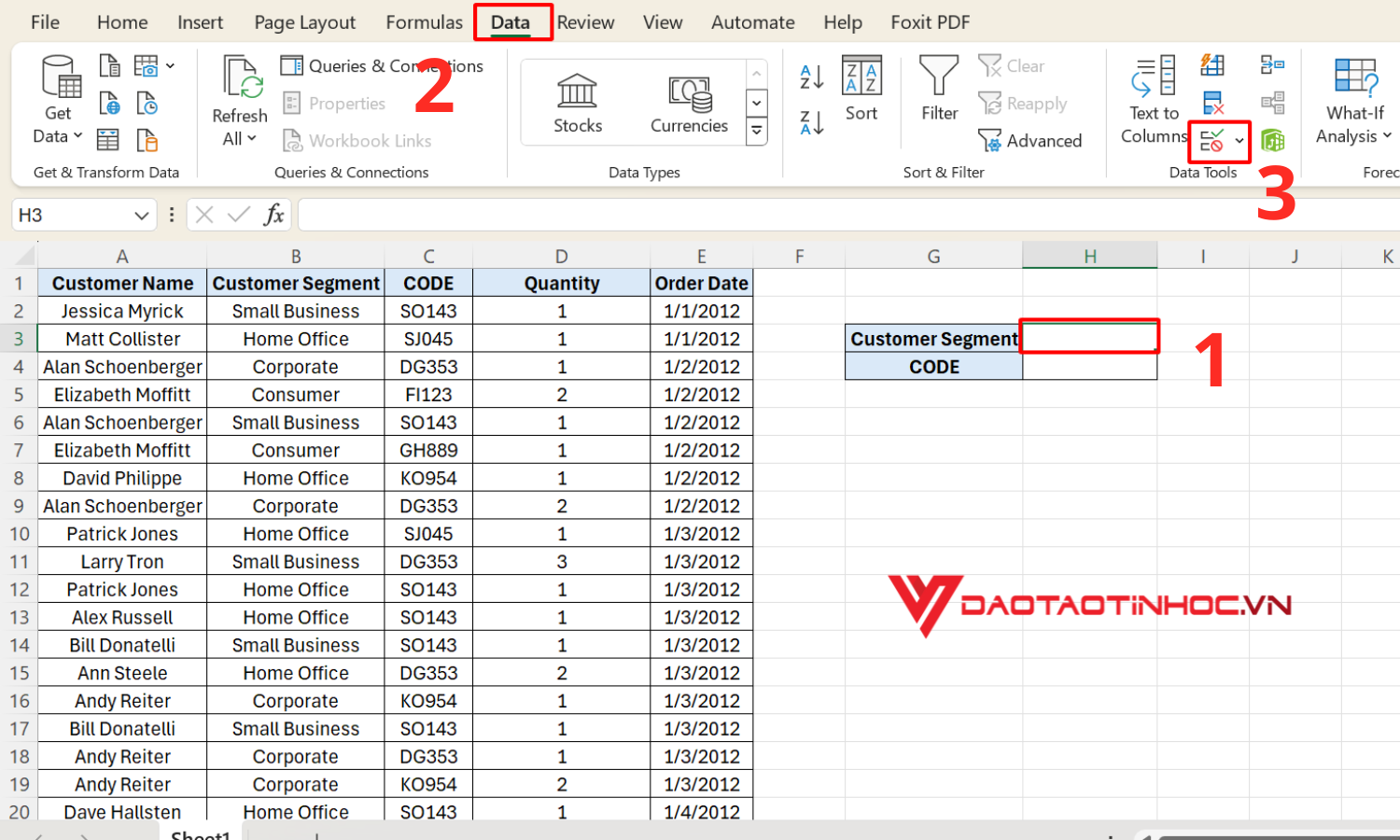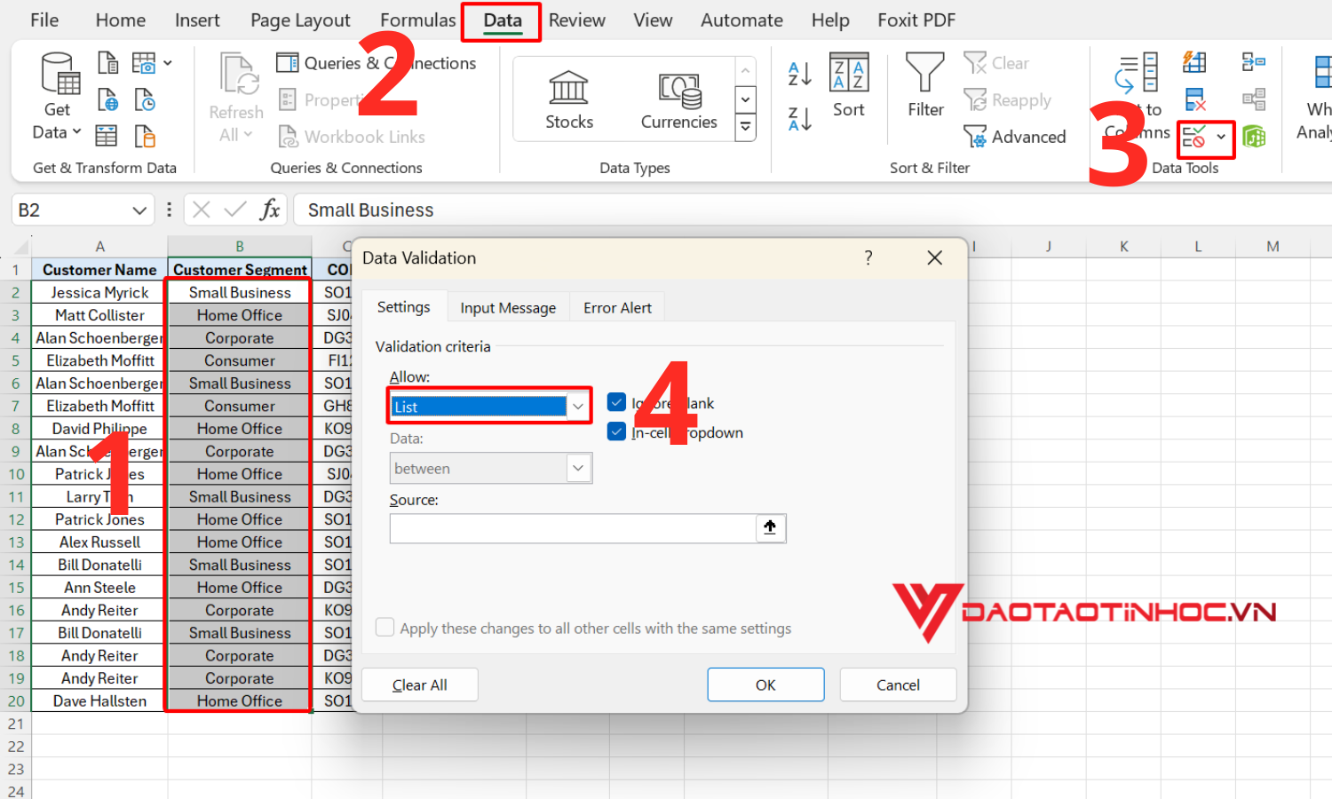 Chọn vùng dữ liệu cần tạo danh sách. Nhấn chọn Data và chọn Data Validation
