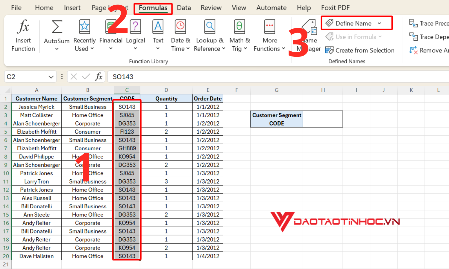 Bước 1: Bôi đen toàn bộ cột CODE. Sau đó, chọn thẻ Formulas rồi chọn Define Name.