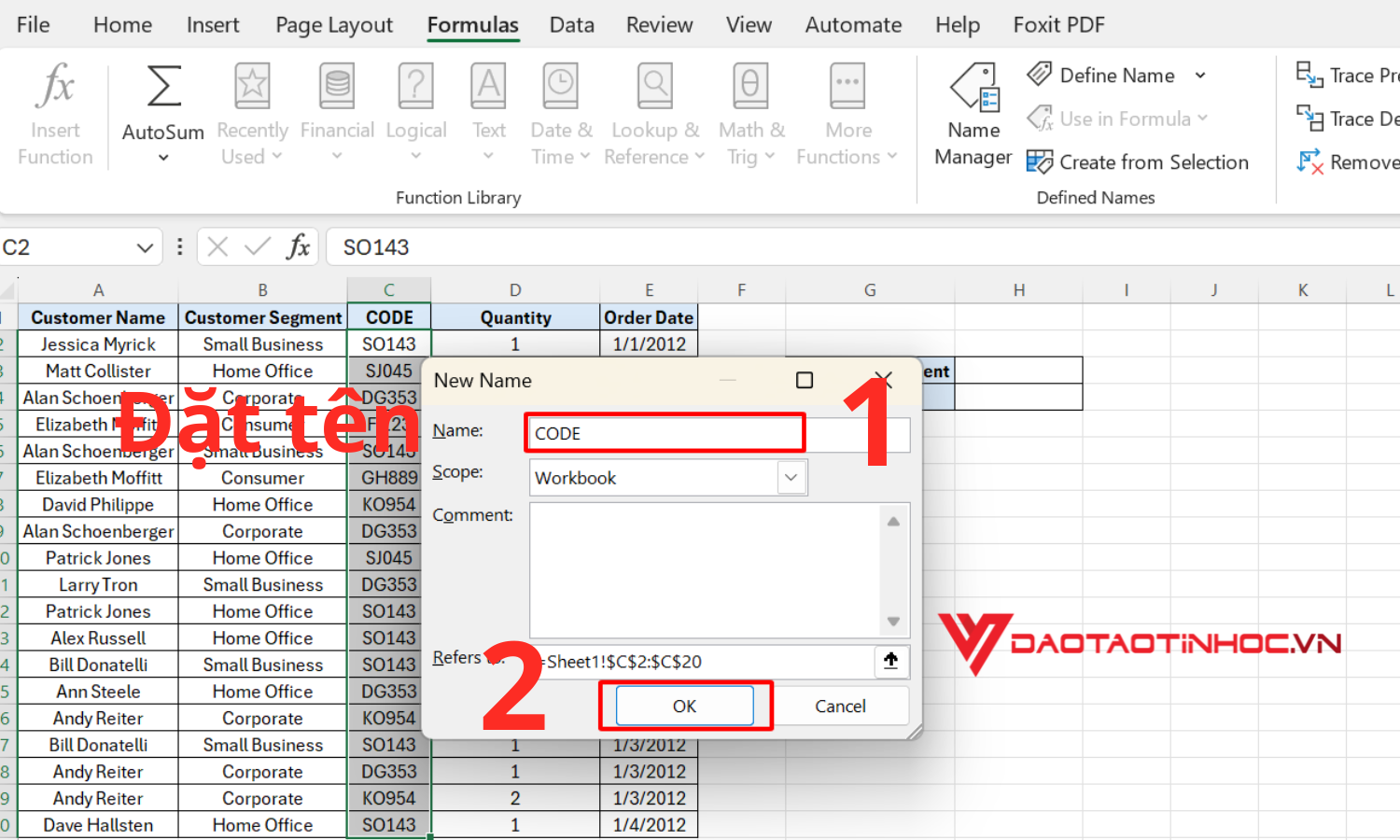 Bôi đen toàn bộ cột CODE. Sau đó, chọn thẻ Formulas rồi chọn Define Name
