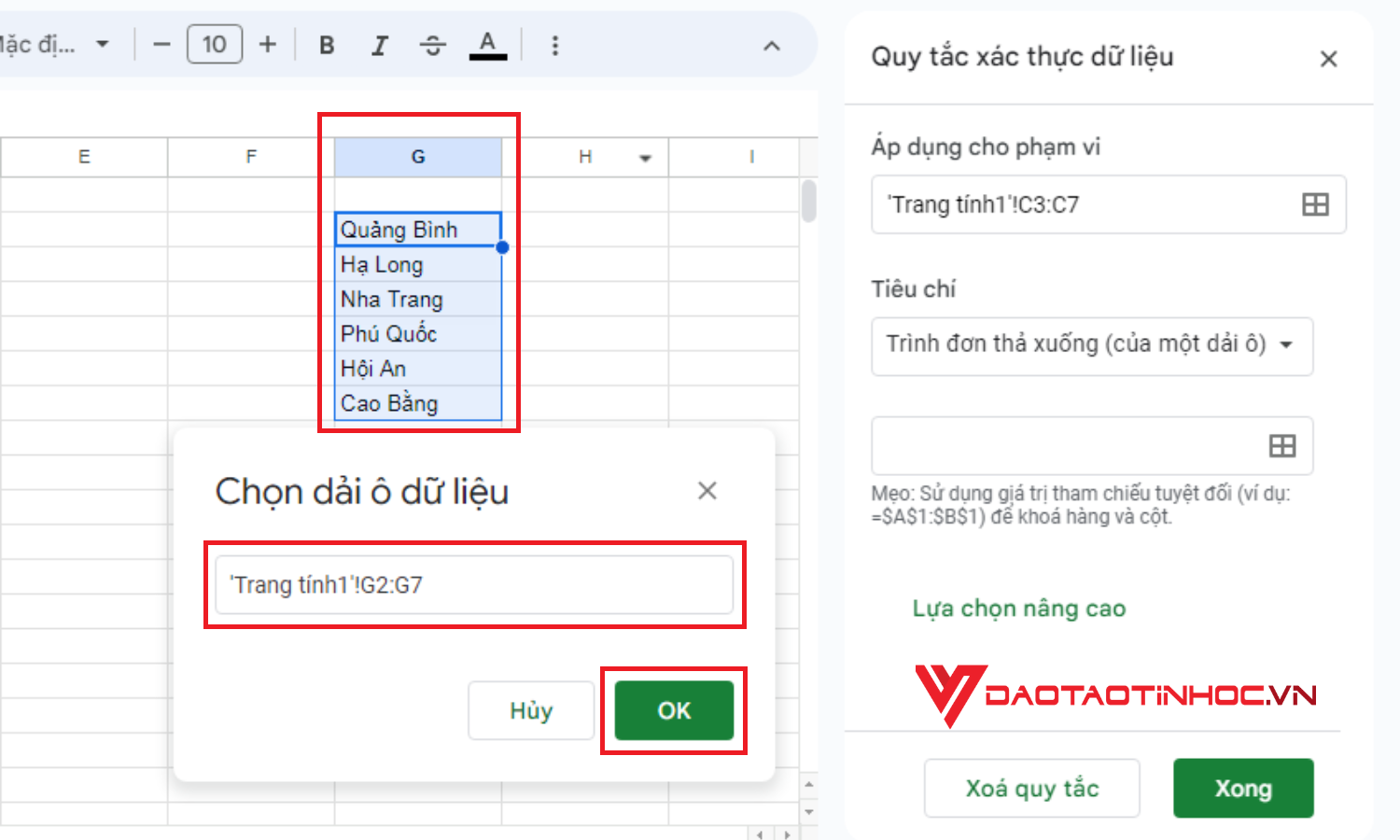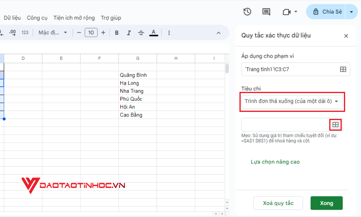 Cách tạo lựa chọn trong Google Sheet khi đã có sẵn dữ liệu trong bảng tính - Bước 4