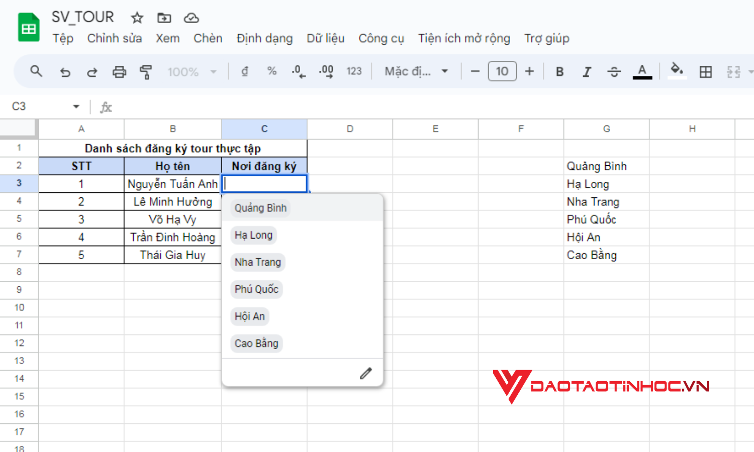 Cách tạo lựa chọn trong Google Sheet bằng cách tự nhập dữ liệu - Kết quả