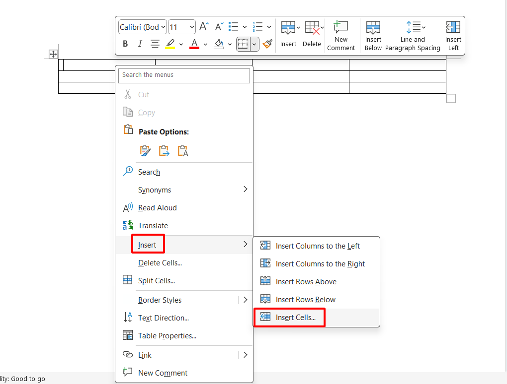 Thêm ô trong Word bằng Insert Cells
