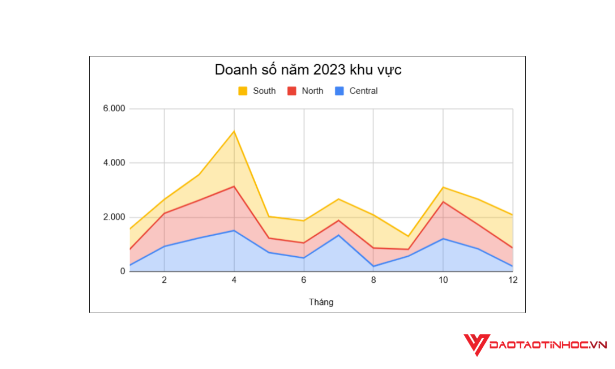 Biểu đồ khu vực (hay còn gọi là biểu đồ miền) là một biến thể của biểu đồ đường với các khu vực được tô màu dưới các đường nối, giúp so sánh dữ liệu liên tục một cách trực quan hơn. Biểu đồ khu vực thích hợp sử dụng để so sánh dữ liệu liên tục và hiển thị tổng cộng dữ liệu.