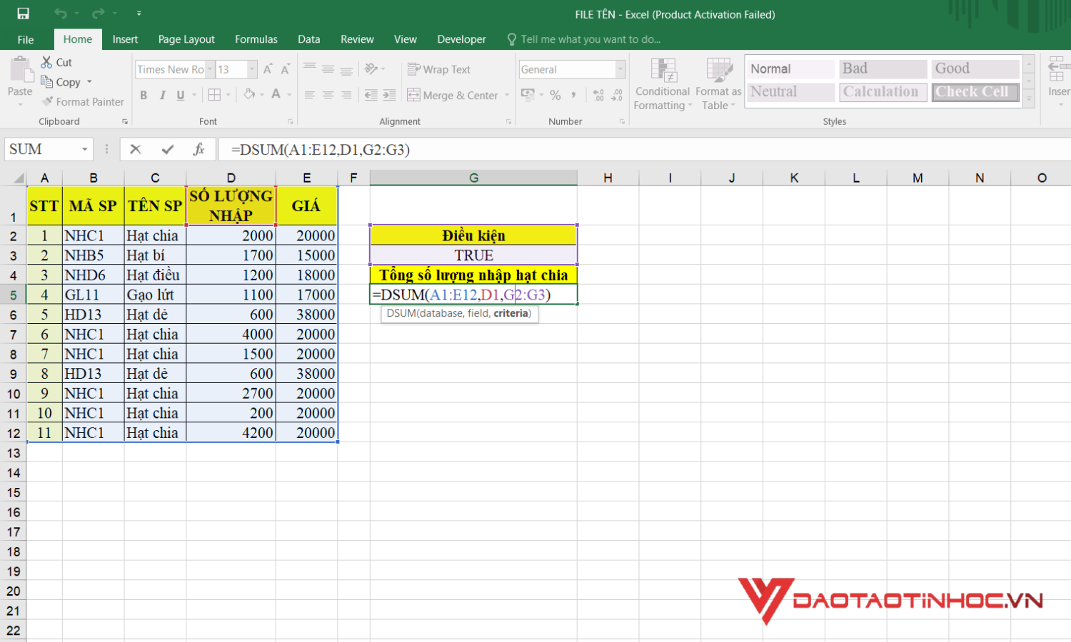 - Nếu sai tên cột hoặc vùng điều kiện, DSUM sẽ trả về lỗi #VALUE!.