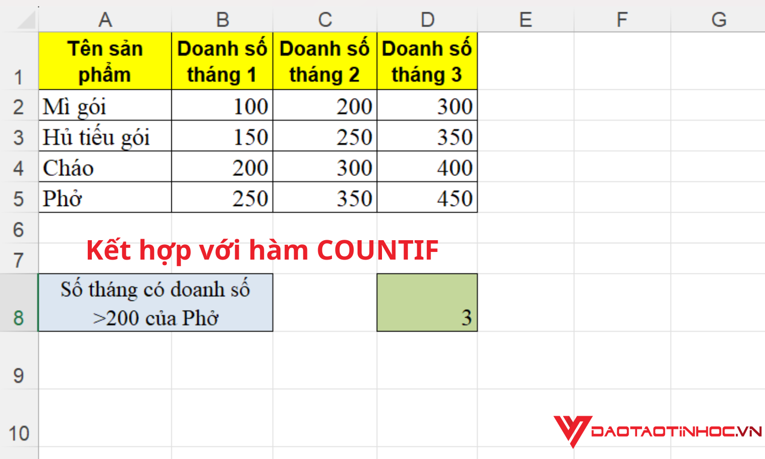 Bước 1: Muốn biết số tháng có doanh số lớn hơn 200 của Phở, bạn nhập hàm =COUNTIF(OFFSET(B1;4;0;1;3); “>200”) vào ô bạn muốn hiển thị kết quả