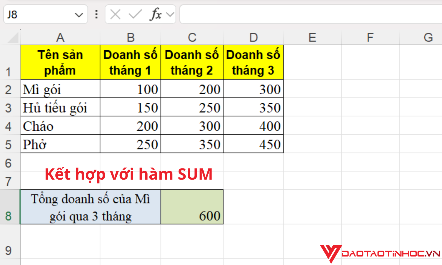 Bước 1: Muốn tính tổng doanh số của mì gói trong 3 tháng, bạn nhập hàm =SUM(OFFSET(B1;1;0;1;3)) vào ô bạn muốn hiển thị kết quả
