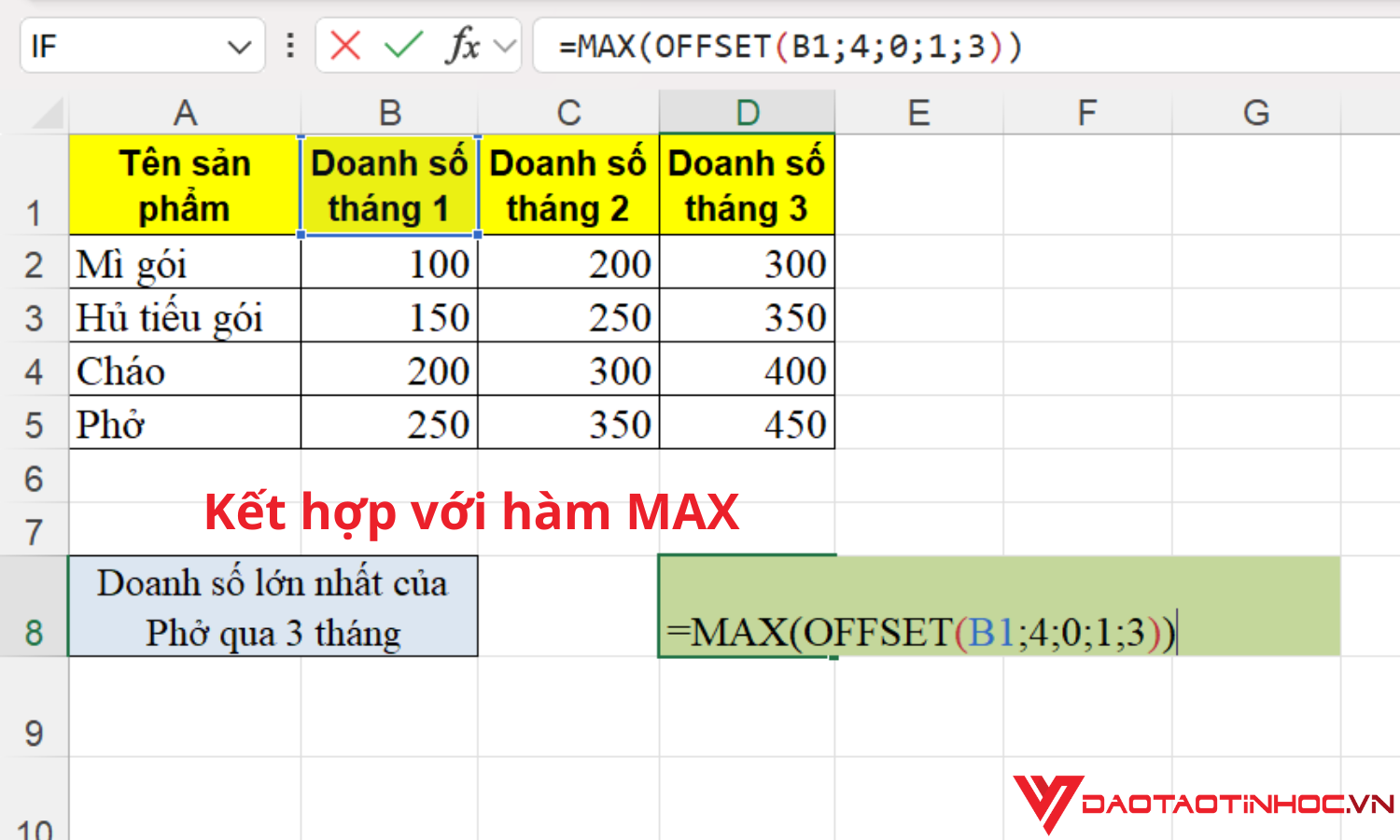 Bước 1: Muốn tính doanh số lớn nhất của Phở trong 3 tháng, bạn nhập hàm =MAX(OFFSET(B1;4;0;1;3)) vào ô bạn muốn hiển thị kết quả