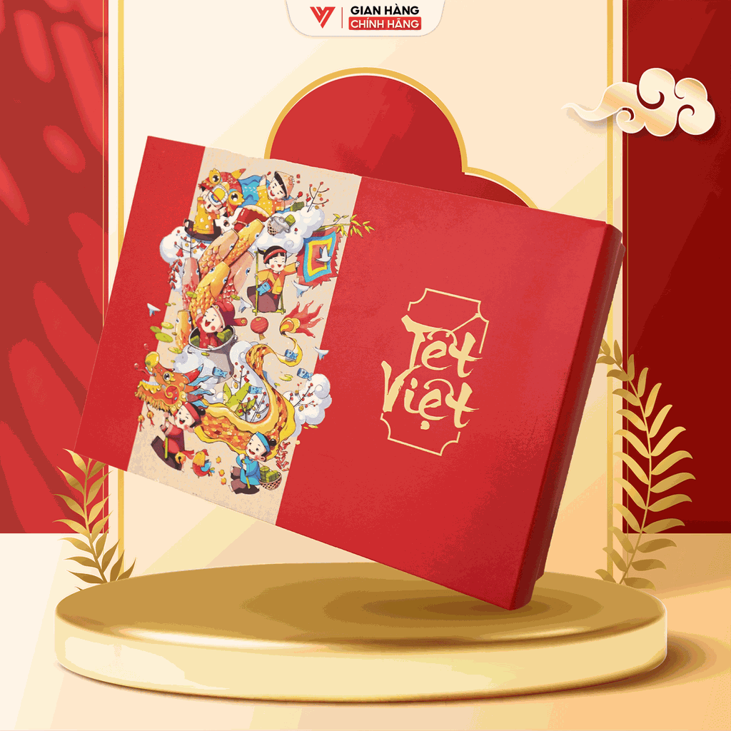 - Hoàn thiện: Ép kim họa tiết Tết, màu đỏ chủ đạo, hình ảnh truyền thống Việt Nam