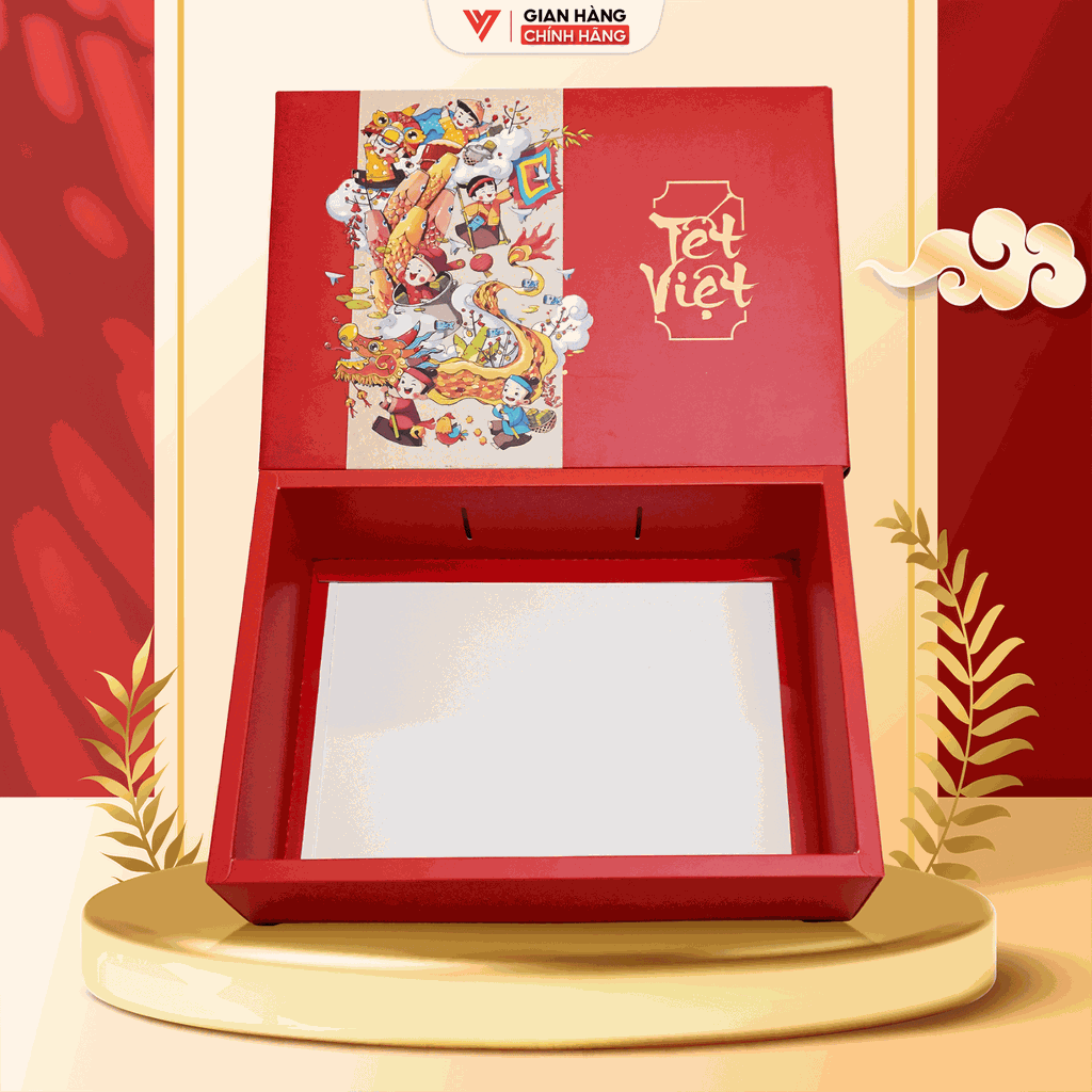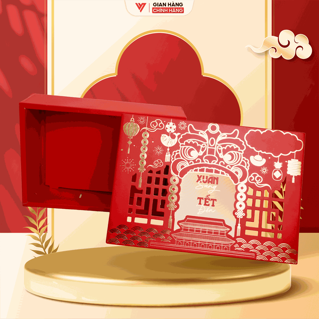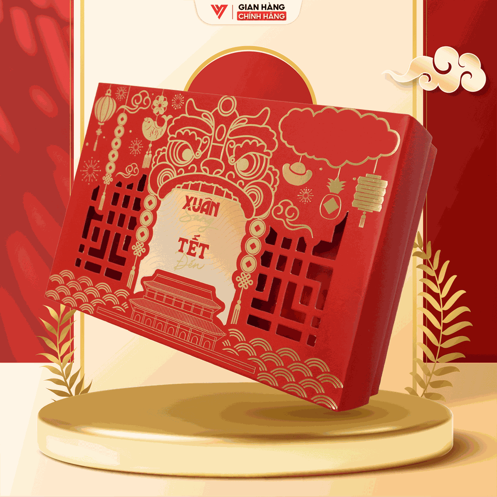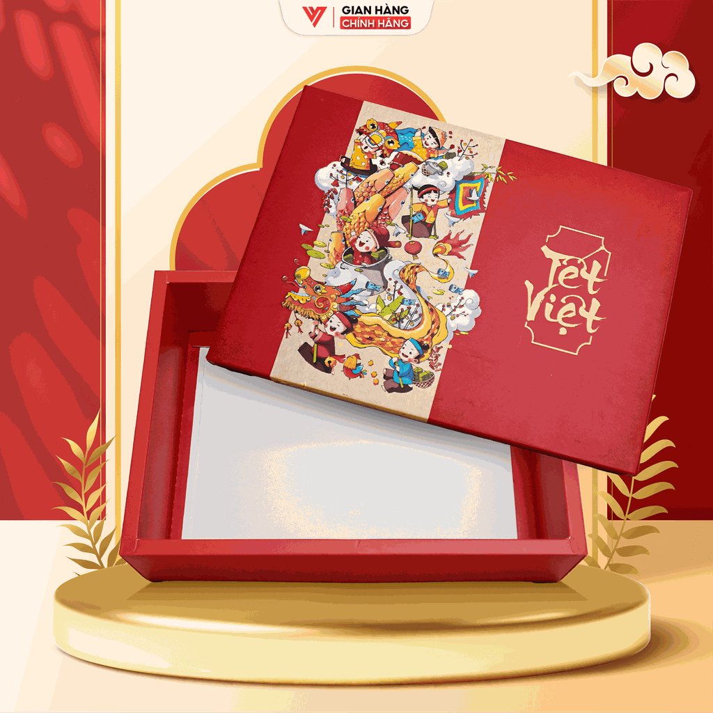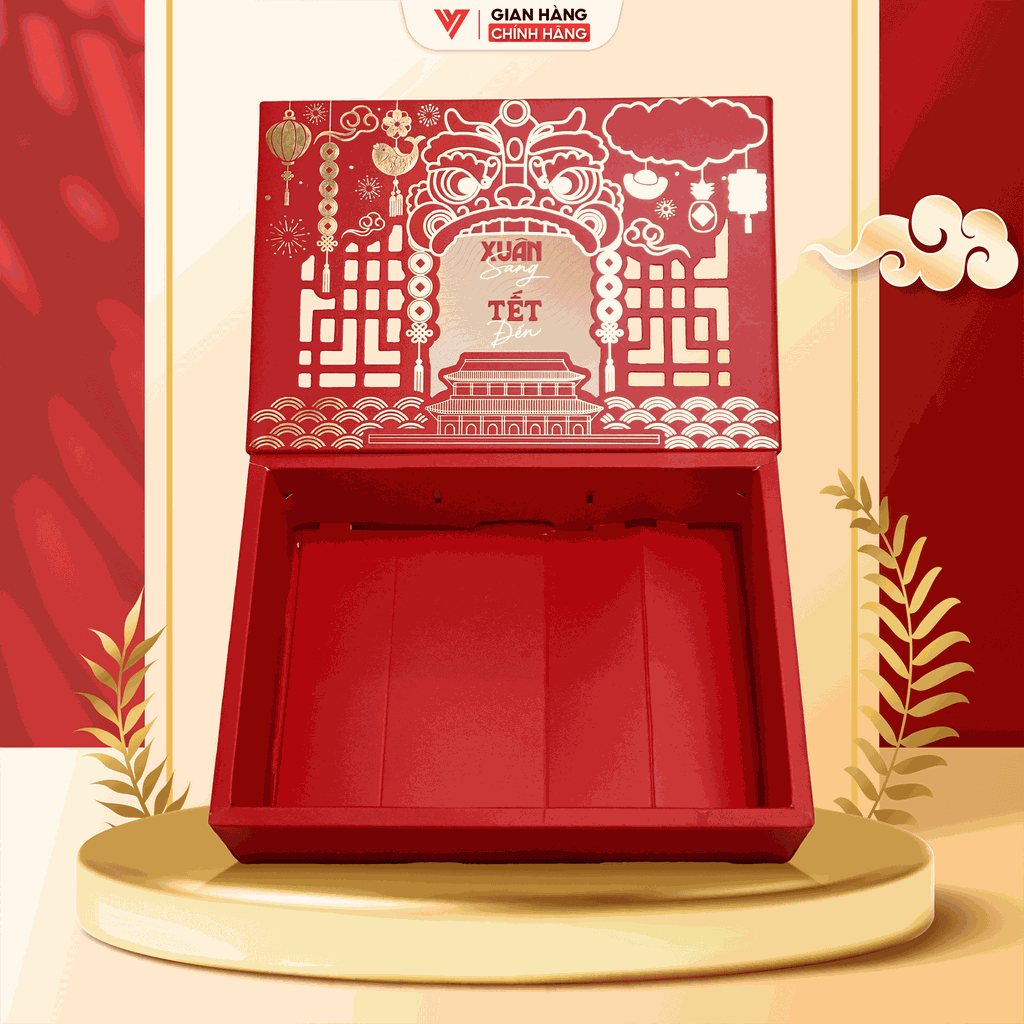- 01 hộp quà Tết cứng nắp âm dương, ép kim họa tiết, thiết kế đồng bộ chủ đề Tết