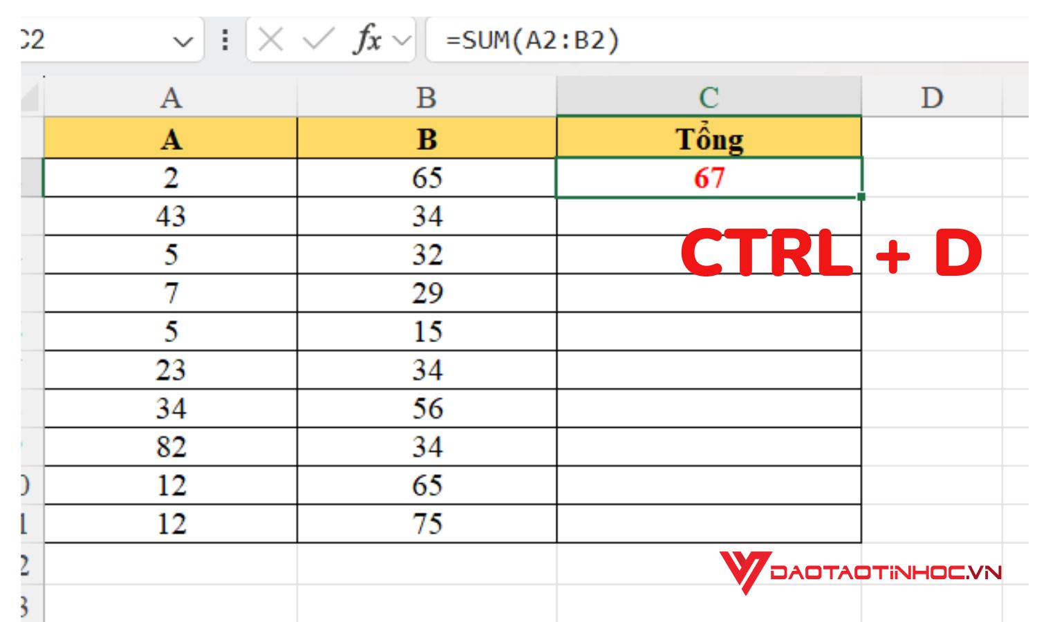 Bước 2: Nhấn tổ hợp phím CTRL + D. Tới đây có thể thấy công thức của cột đầu tiên đã được sao chép và cho ra kết quả cho cả cột như hình.
