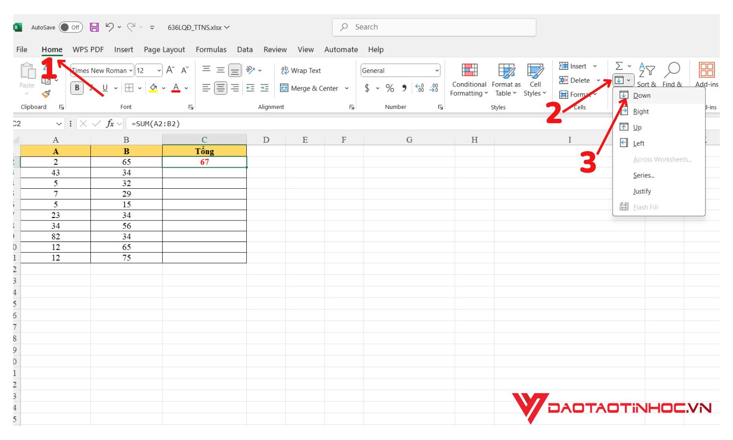 Bước 2: Trong tab Home, nhóm Editing ta chọn Fill -> Down