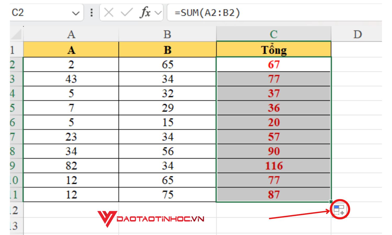 Lập công thức cho cả cột bằng tùy chọn Fill