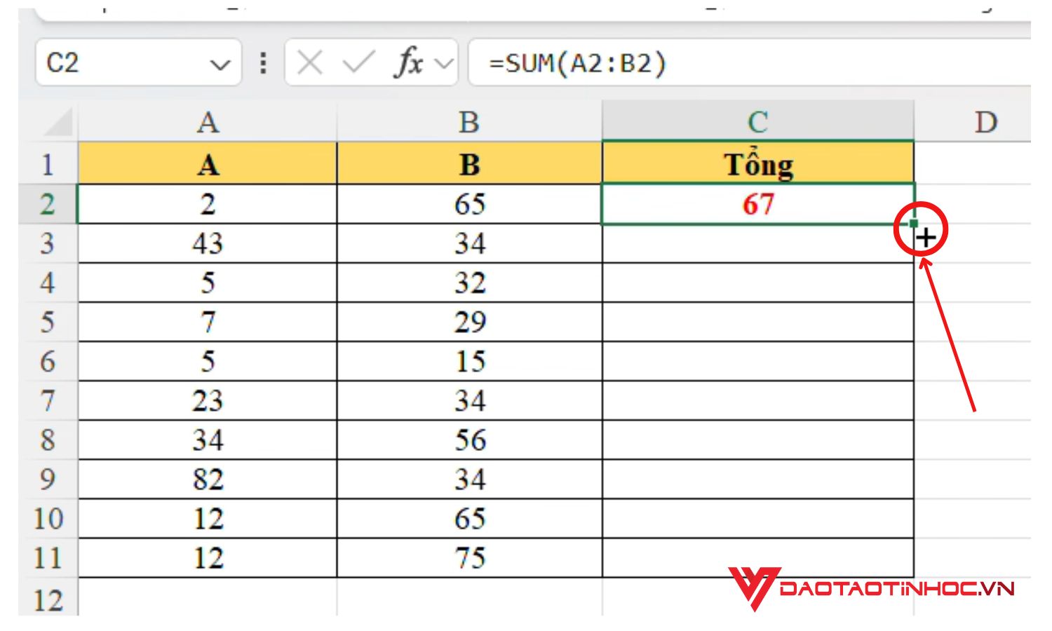 Bước 2: Trỏ chuột vào ô vuông nhỏ ngay góc dưới bên phải của ô. Đến khi xuất hiện biểu tượng dấu +