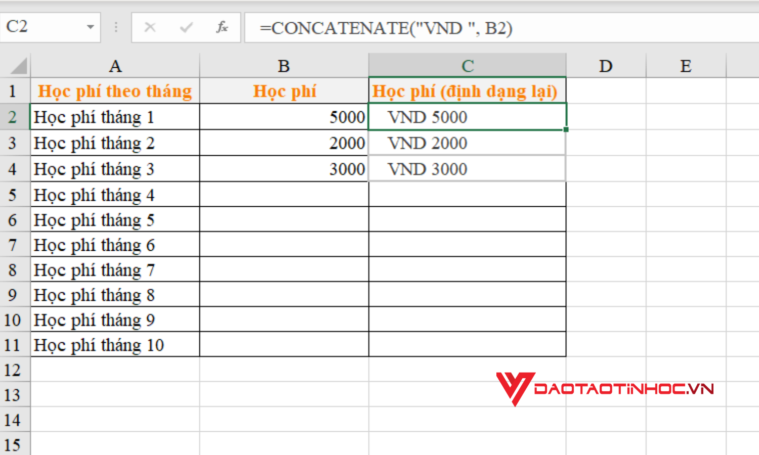 Trong Excel, bạn có thể kết hợp các số và ký hiệu tiền tệ vào một ô bằng cách sử dụng các công cụ như CONCATENATE, TEXT hoặc toán tử &. Ví dụ, để thêm ký hiệu tiền tệ "VND" vào số trong cột B, bạn có thể áp dụng công thức sau.