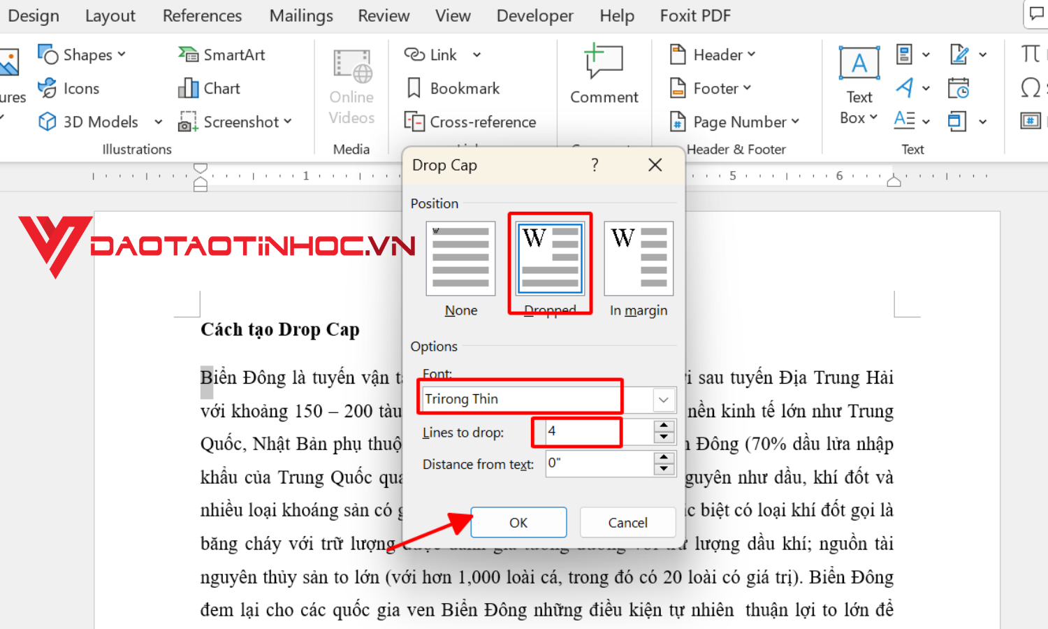 Giả sử ở đây chọn Position là Dropped, kiểu chữ Trirong Thin và Lints to Drop là 4. Thì sẽ có kết quả như sau: